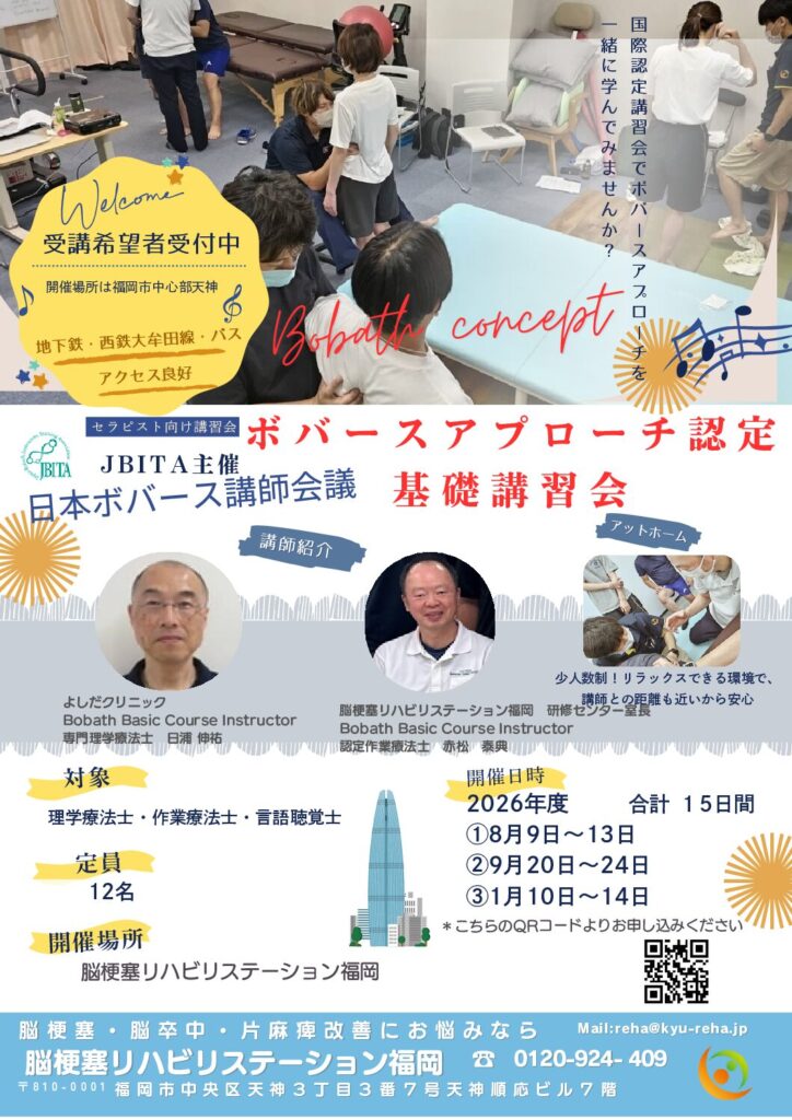 テーマ・内容・注意事項:ボバース認定基礎講習会 ①ボバース概念の歴史と継続的な発展を理解する ②中枢神経障害の評価と治療にICFの原則を用いていることを理解する ③機能的な活動の準備中および活動中における効率的な姿勢・運動制御の分析と促通について理解する ④中枢神経系が障害されたことによる機能的な活動への影響について理解する ⑤非効率的な運動および機能を観察、分析し介入を通じて、これらに影響を与えることができることを理解する