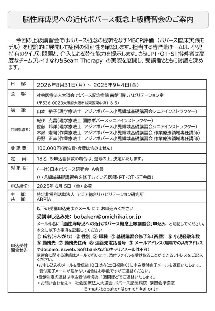 メール件名に 「脳性麻痺児への近代ボバース概念上級講習会」申込み と明記してください。本文に以下の事項を記載してください